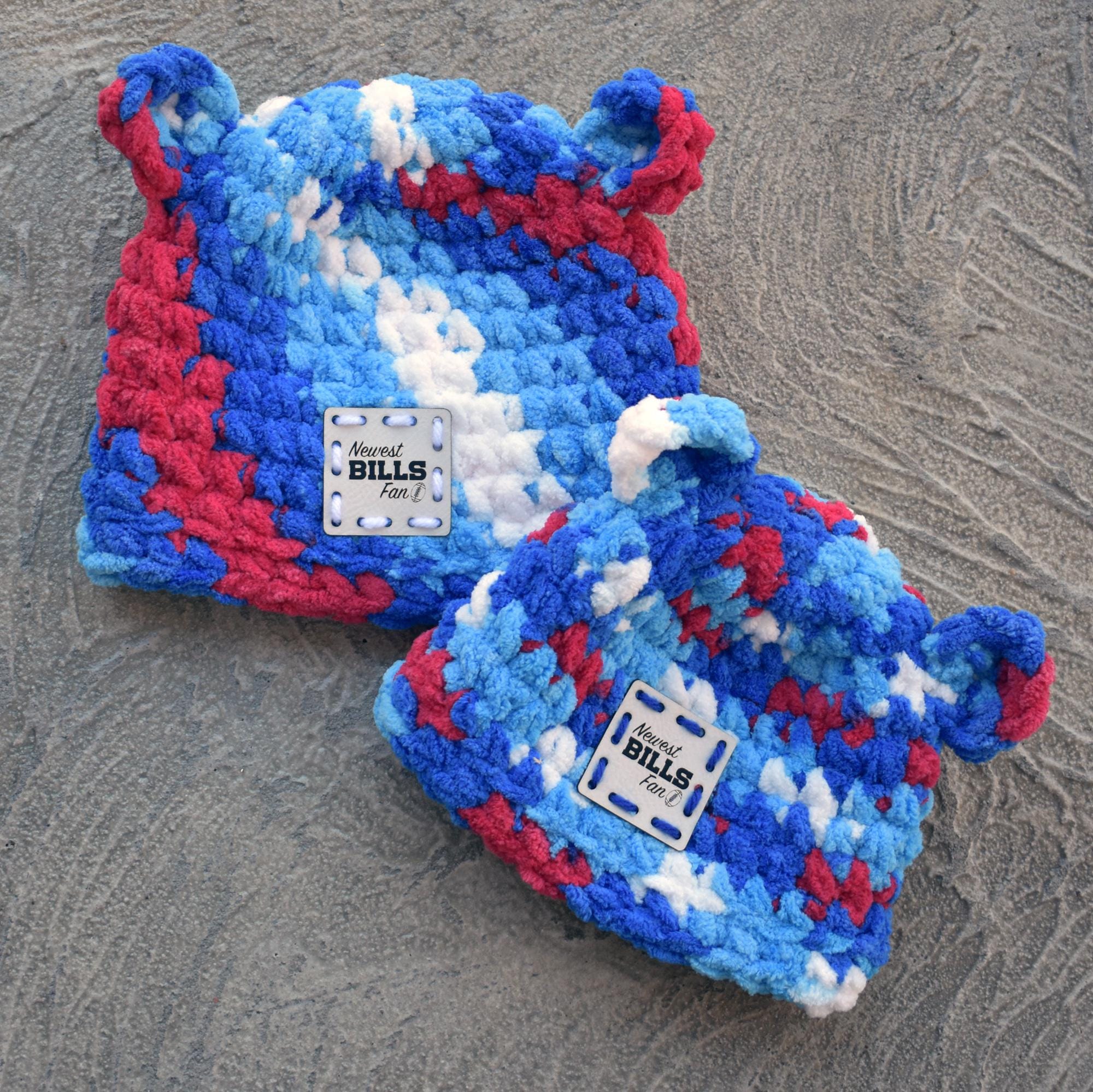 Introducing the "Newest Bills Fan Bear Hat" made from super bulky soft Bernat baby blanket yarn – charming essentials designed to blend warmth with playful appeal. Each hat is meticulously handmade and the adorable bear ear detailing will make your little one not want to take this hat off. Ideal for cooler climates and outdoor activities, these sets ensure both comfort and durability. Whether building snowmen or exploring the outdoors, our hats and cowls promise to keep young ones cozy and content. Elevate their winter wardrobe with a touch of joy and practicality – because their happiness and comfort are priority.